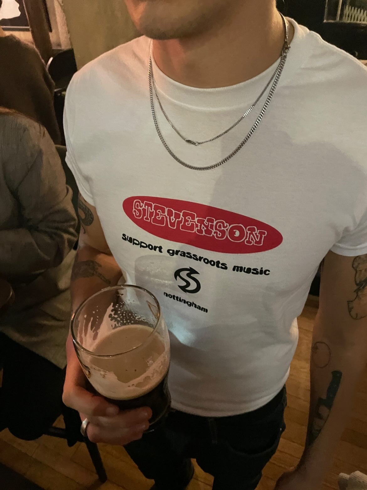 STEVENSON MUSIC WEAR IS A NOTTINGHAM BASED CLOTHING BRAND THAT SUPPORTS GRASSROOTS MUSIC AND INDEPENDENT MUSIC VENUES IN THE UK. THESE PLACES PLAY A CRUCIAL ROLE IN THE DEVELOPMENT OF BRITISH MUSIC, NURTURING LOCAL TALENT AND PROVIDING A PLATFORM FOR ARTISTS.