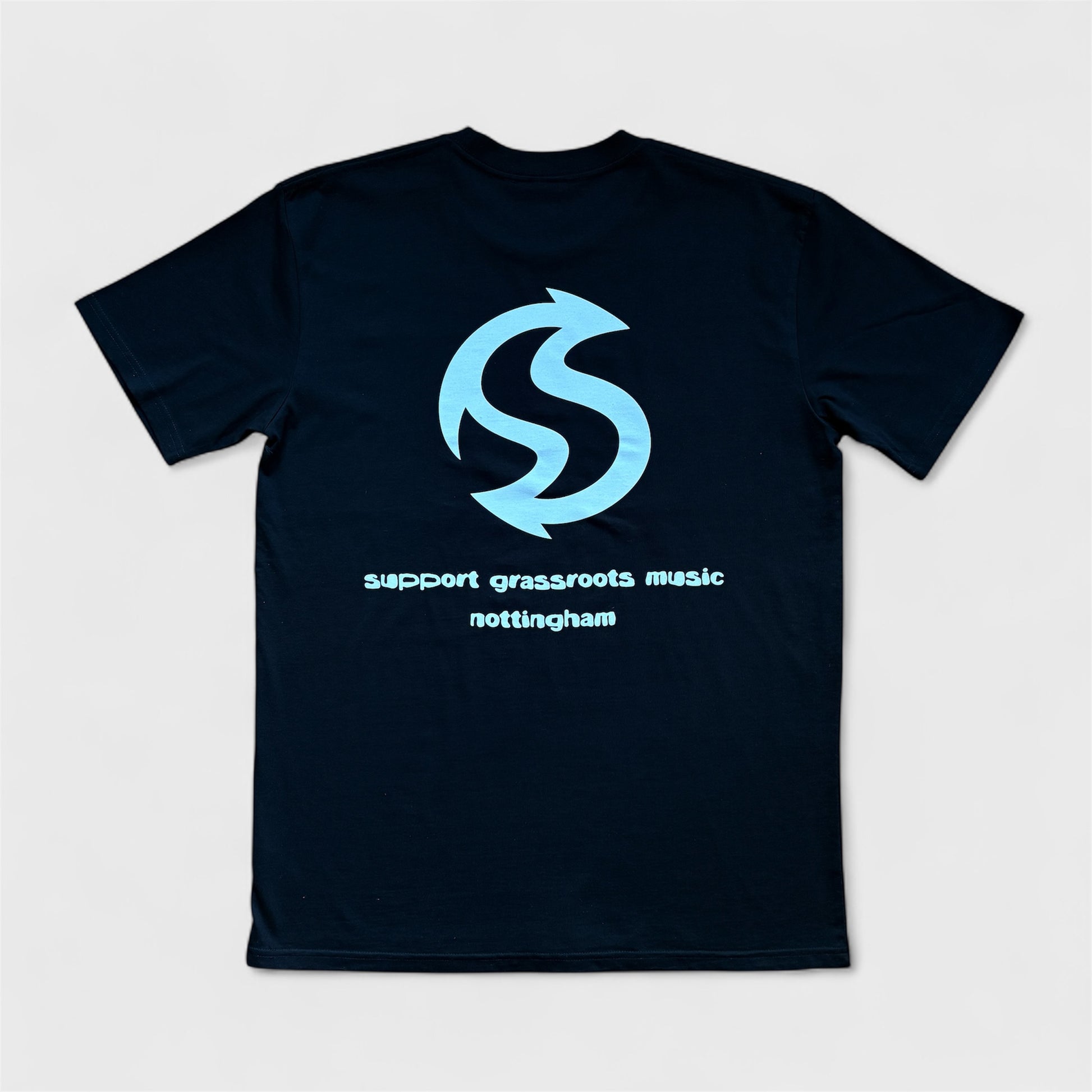 Premium mid weight 220 gsm tee, screen printed with the brand logo and "support grassroots music" along with "nottingham" where the brand was born and inspired.