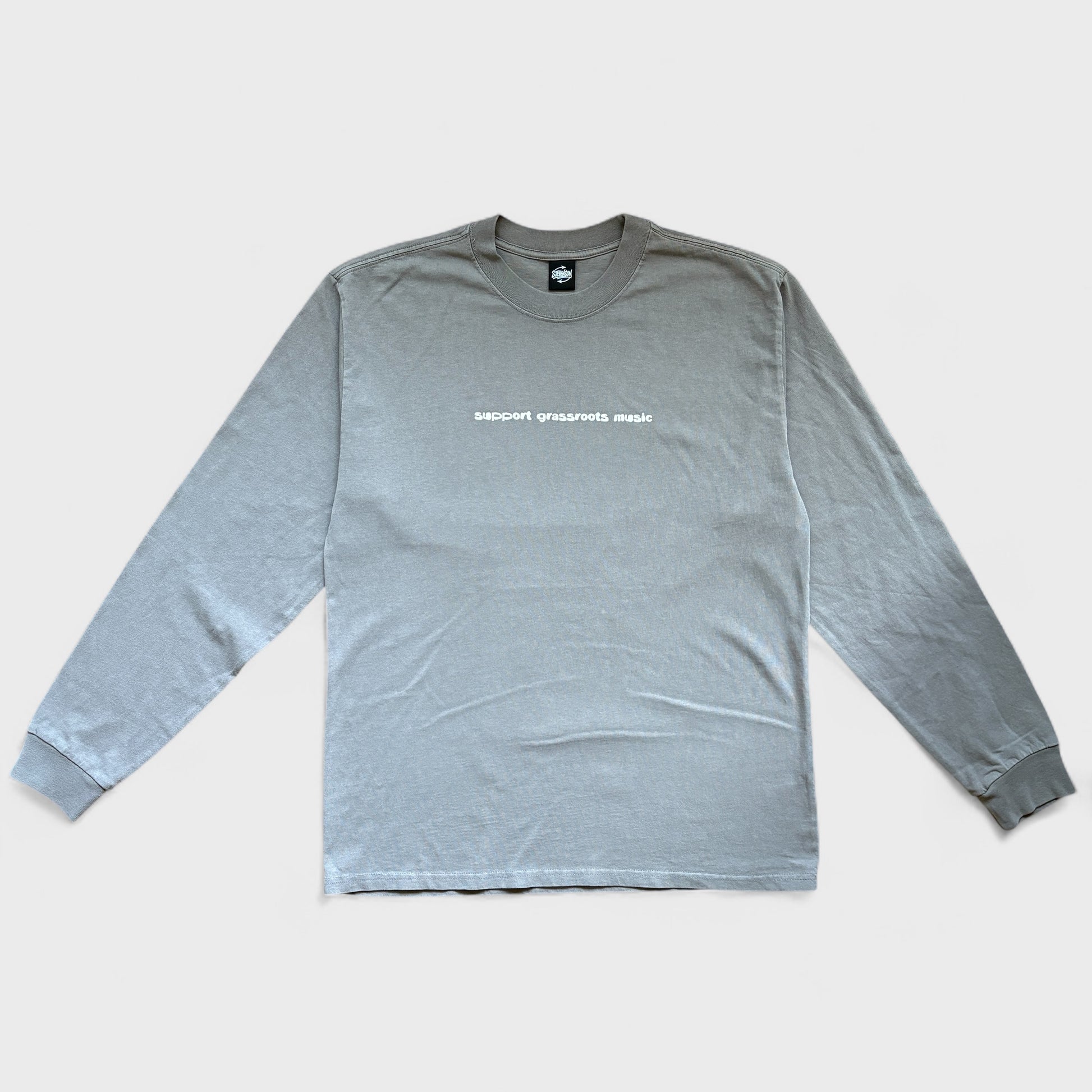Premium heavy weight 240 gsm, relaxed fit long sleeve tee with screen printed "support grassroots music" graphic to the front and Jester design to the back.